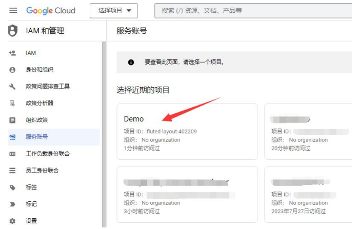 打开下方网址,选择新建或之前的项目 https://console.cloud.google.com/projectselector2/iam- admin/serviceaccounts?supportedpurview=project